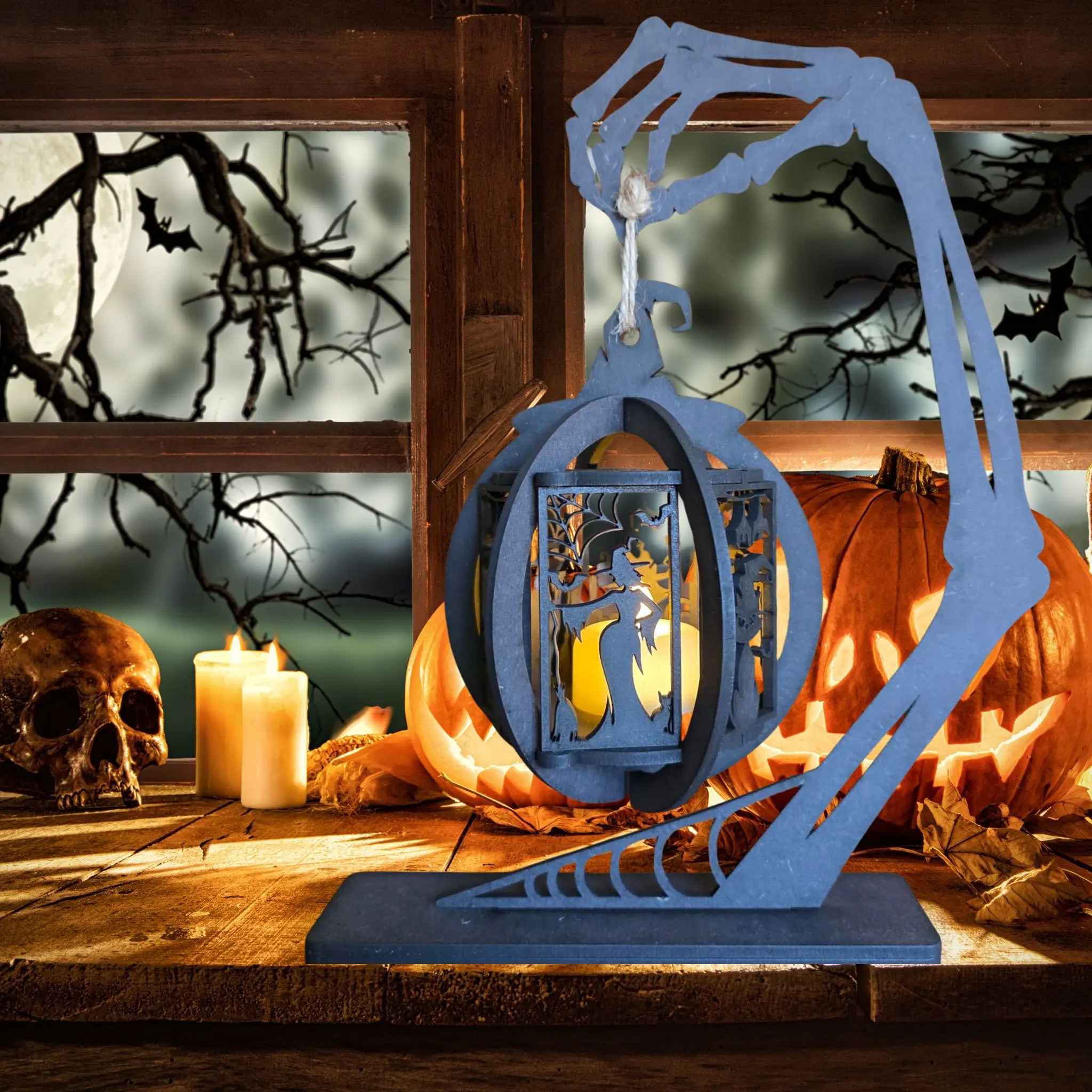 Bring a haunting glow to your Halloween décor with this laser cut Witch and Cat Skeleton Lantern. Crafted from high-quality MDF, this intricate lantern features a spooky skeletal hand stand, holding a hanging lantern with beautifully detailed silhouettes of a witch, black cat, bats, and twisted trees. Perfect as a Halloween centrepiece, mantel decoration, or party prop, it adds a ghostly touch to any haunted home.